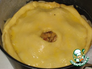 Из 1/3 части теста раскатать круг, накрыть «Горшочек», защипать по краям. В центре на тесте вырезать небольшое отверстие. Смазать яйцом или молоком. Через отверстие в центре залить 50-70 мл слитого бульона.