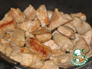 Мясо порезать на кусочки, обжарить на раскаленной сковороде до румяной корочки, присыпать зеленью (базилик и петрушка), посолить, залить горячей водой, чтобы только прикрыло мясо и тушить под крышкой до полуготовности. -