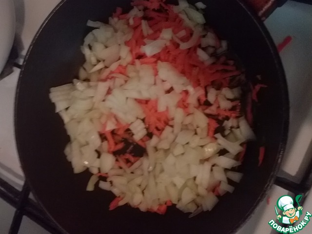 Пока наша курочка варится... Лук режем мелкими кубиками. Морковь трем на мелкой терке. Обжариваем наши овощи на подсолнечном масле.