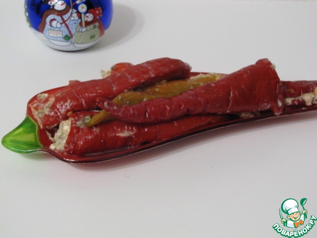 Перчики разрезать, нафаршировать тунцово-творожной массой. Завернуть в тонко нарезанные полоски слабосоленого лосося. Подавать в качестве закуски к крепким аперитивам. Особенно оценят эту закуску любители остренького.