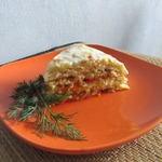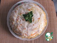 Таким образом, чередуя слои, формируем торт. Верхний слой смазываем майонезом. И можно приступать к тортопоеданию! (Можно есть холодным, а можно подогреть — сыр расплавится и будет вкуснотища)