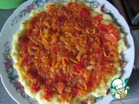 На тарелку выкладываем первый «блин», на него половину помидорно-морковной обжарки.