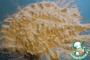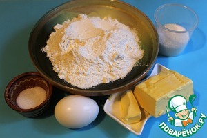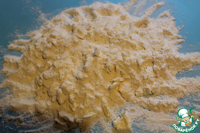 Просеиваю муку, добавляю сахар, щепотку соли и кусочки охлажденного сливочного масла. Тщательно перетираю все до крошки.