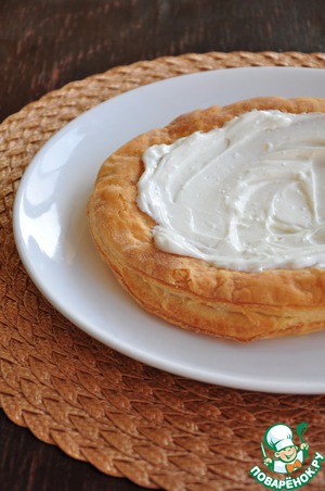 Тесто разморозить, присыпать мукой, раскатать. Вырезать круги размером с небольшое блюдо. Форму для запекания сбрызнуть водой, выложить тесто в форму. В середину теста выложить сухой горох, выпекать при 200* - 15 минут. Остудить.