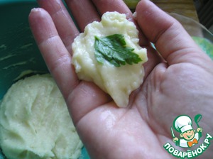 Или можно сделать сначала типа лепешечки, положить внутрь листик петрушки,