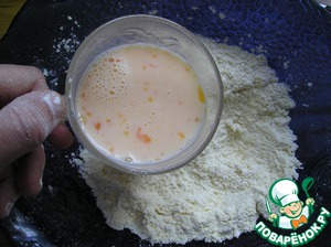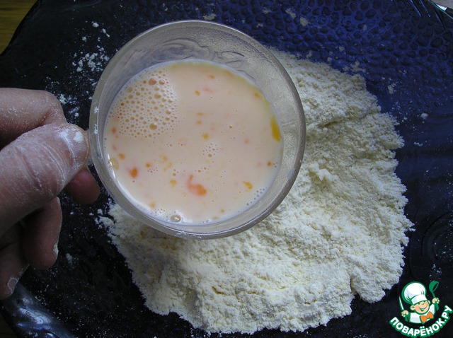 В чашку налила молока на 1/3 и разбила туда же яйцо. Смешала все вилкой и добавила в мучную смесь.