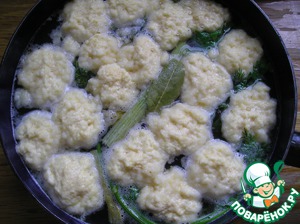 Отвар готов и нужно сделать клецки. Чайную ложку сначала нужно обмакнуть в горячую жидкость, потом набрать в нее теста и опустить в еле-еле кипящий отвар.