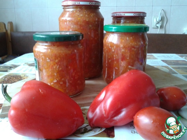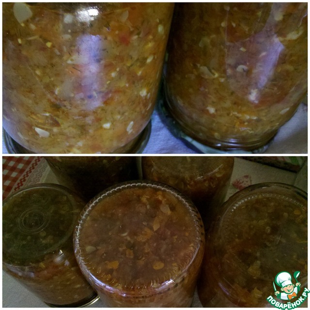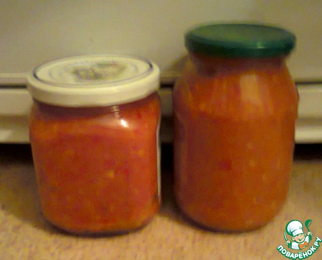 Я взяла 0.5 кг помидоров, остальной кг заменила баночкой хорошей томатной пасты. Во-первых, жаль было свои помидоры, у меня их немного, во-вторых, перец и кабачок при прокрутке через мясорубку дали много сока, не хотелось отцеживать или упаривать. В конце по той же причине заменила 9% уксус 70% уксусной кислотой (пересчитала, получилось 13 мл). И положила чеснока поменьше раза в два.