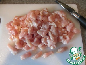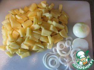 Картофель почистить и порезать. Лук почистить и порезать кольцами.