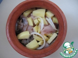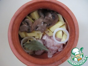 На дно горшочка наливаем немного растительного масла. Затем складываем туда индейку, картофель, грибы и лук. В каждый горшочек кладем лавровый листик. Солим, перчим, добавляем любимые приправы.