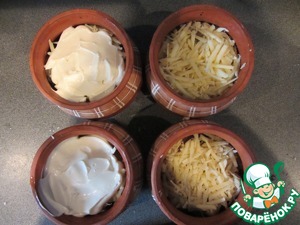 Затем делаем «шапочку» для горшочка. Кладем сверху тертый сыр и смазываем майонезом.