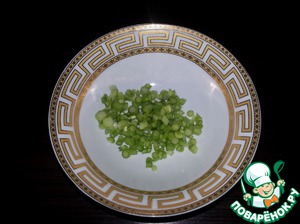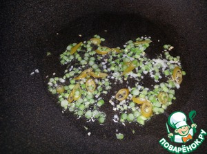 Мелко нарежем зеленый лук, чеснок, и порежем небольшими кружочками перец.