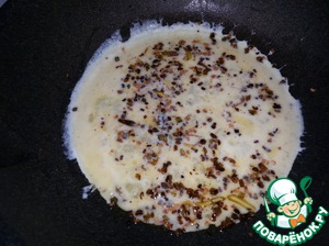Влить взбитые яйца и накрыть крышкой сковороду, как яйца хорошо прихватяться - перевернуть на другую сторону. Довести до готовности.