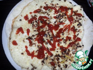 На лаваш выложить омлет, да простят меня в индии за то, что я добавляю к омлету кетчуп.