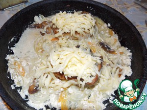 Посыпаем сыром мясо и ставим в духовку еще минут на 15 до появления золотистого цвета.