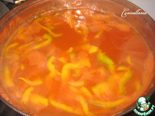 Вылить сок в кастрюлю и поставить на небольшой огонь. После того, как сок закипит добавить 2 ст. л. соли, 8 ст. л. сахара, 4 ст. л. уксуса и болгарский перец, нарезанный соломкой.
