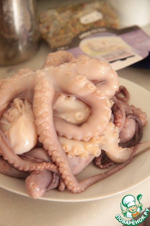 Рецепт очень простой и вкусный. Вариант приготовления при отсутствии осьминога - взять морской коктейль, будет не менее вкусно. И так, нам понадобится осьминог, которого мы предварительно разморозили.