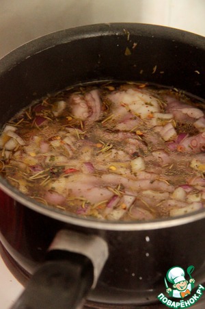 Положим в кастрюлю лук и оливковое масло, немного пассируем до мягкости, затем кладем осьминога, специи и наливаем воду так, чтобы осьминог был закрыт жидкостью.
