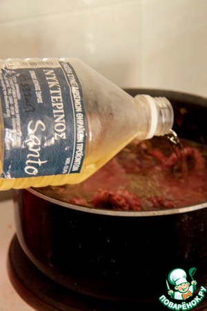 Как только вода закипит, доливаем вино и томатную пасту и снова доводим до кипения.