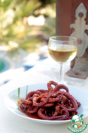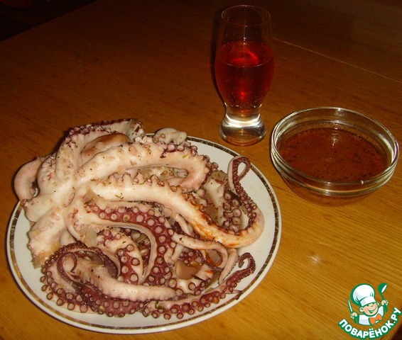 Если вы любите более острое, то можно добавить немного чили. Выкладываем нашего осьминога на тарелку, наливаем вино и наслаждаемся нежным вкусом морепродуктов.