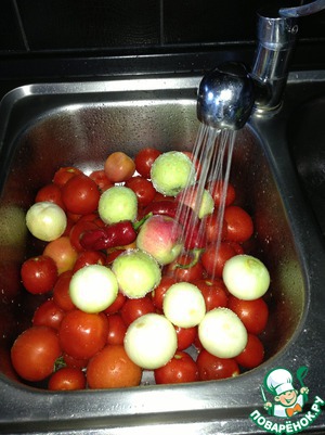 Теперь все это дело пропускаем через мясорубку (помидоры, лук, яблоки и еще красный перец чили).