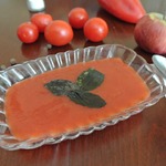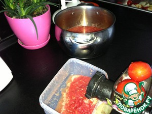 Я, т. к. у меня был помидор твердоватый, залила все это в блендер и перемолола (если у вас спелый мягкий помидор... можете в блендере не перемалывать).