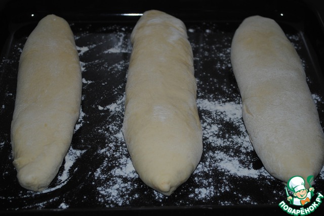 Скрепляем края. перекладываем на противень швом в низ. даем постоять до увеличения батонов в 2 раза. У меня стояли 40 мин.