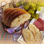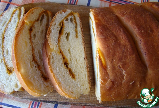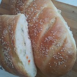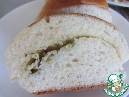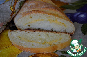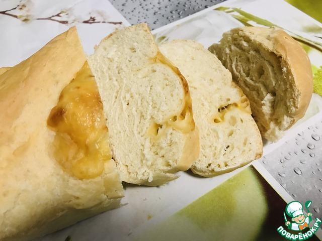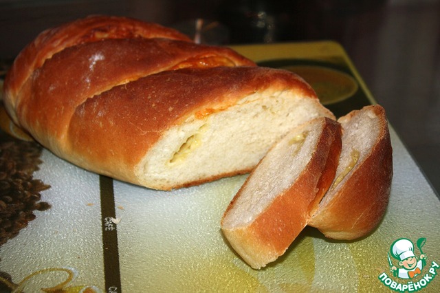 На днях, зашла в кабинет к коллегам, а у них в пакете лежат 4 батона, я не удержалась и потрогала, они оказались такими мягкими! Дрожжевое тесто это моя самая слабая слабость! Говорю, отломите кусочек, а то умру! Мне говорят, да бери уж весь, там в середине самая вкуснота! Оказалось, внутри батона сыр с чесноком! Съела пол батона! Ну и решила, что в выходные обязательно попробую приготовить подобный! Смотрите, что получилось!