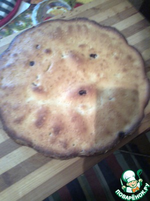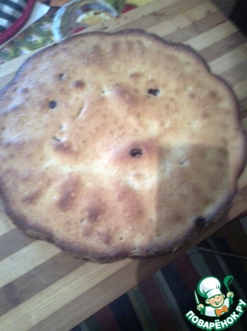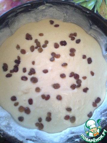 Форму смазать маслом и присыпать мукой. Влить тесто. Сверху можно добавить изюм. Поставить в разогретую духовку.