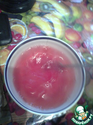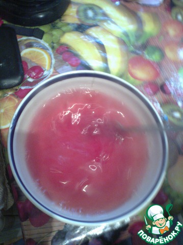 Пока готовится бисквит, делаем желе. ВНИМАНИЕ. То что написано на пачке - НЕ ПРАВИЛЬНО. Воды берём половину от указанного. Можно добавить немного желатина и оставляем остыть, но не застыть.