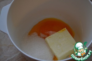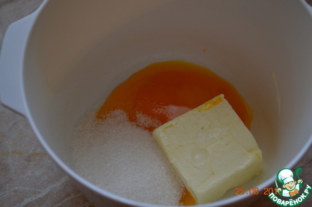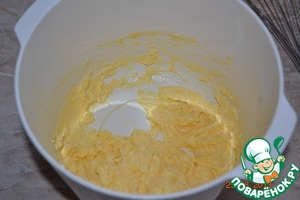 • 1. Для начала займемся яйцами и отделим белки от желтков. Затем размягченное сливочное масло разотрем с желтками и сахаром. Белки уберем в сторону, они понадобятся нам позже.