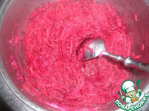 Рецепт невероятно прост в приготовлении-с помощью левой насадки кухонного комбайна нужно натереть 1/2 чашки моркови и 2 чашки свеклы.