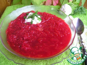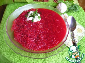 Этот борщ подается как в горячем, так и в холодном виде, с добавлением по 1 ст. л. сметаны в каждую порционную тарелку.