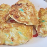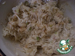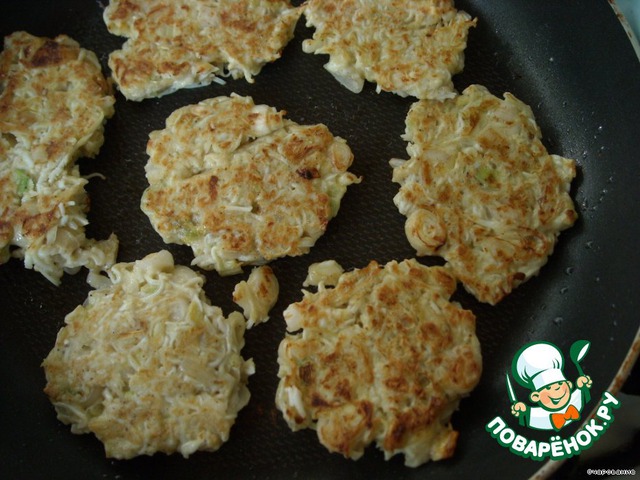 Лук нарезать и обжарить, яйца отварные натереть на терке, соединить с луком, добавить сырое яйцо, соль, перец, перемешать. Жарить на масле выкладывая массу ложкой.