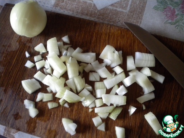 Лук - кубиками (чуть крупнее, чем на зажарку в суп).