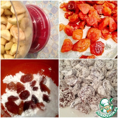 Раскладываю грушки на разносе, застланном пергаментом, накрываю марлей - и на балкон сушиться. На второй день можно посыпать их сахарным песком или пудрой. Но, честно говоря, вспомнила про них только на 4й день, когда цукаты были готовы.