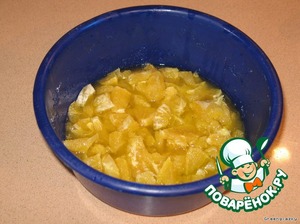 Апельсин очистить и нарезать тоненькими дольками, засыпать сахаром. Оставить на 20 минут, дождаться, пока апельсин пустит сок и растворит сахар.