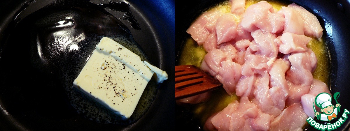 Куриную грудку нарезать на небольшие кусочки, выложить в растопленное масло. -