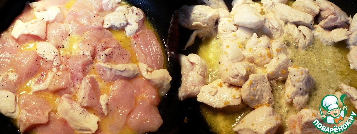 Обжарить птицу до полу-готовности, лимонную цедру натереть на мелкой тёрке, добавить к курице-перемешать.