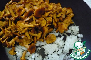 Вареные лисички вылить в дуршлаг и дать слиться отвару. В сковородку налить 2 ст. л. масла, положить мелко нашинкованный лук и лисички. Обжарить 5 мин.