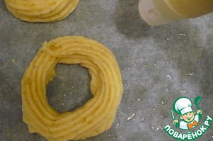 Теперь выкладываем его в корнетик и делаем кольца на противень, застеленный пергаментом и смазанный маслом. -