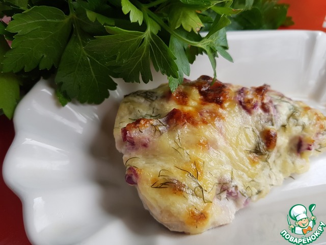 Выложить эту смесь сверху на куриное филе, запечь в духовке.