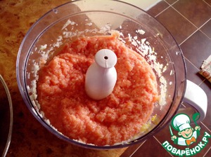 Помидоры, чеснок и патиссоны пропустить через мясорубку либо измельчить в блендере.