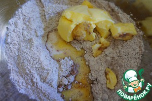 К сухой смеси добавим молоко, яйцо и размягченное сливочное масло.