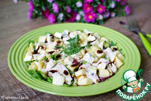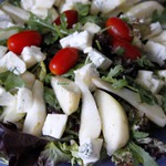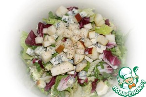 Можно сделать салат чуть иначе: выложить на блюдо слой салатной смеси, затем добавить кусочки курицы, сверху положить нарезанную грушу или яблоко, сыр (здесь бри и дор блю), сбрызнуть салат кремом-бальзамик.