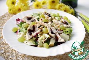 И вот такой вариант: салатная смесь, сыр, груша, курица, виноград, крем-бальзамик.