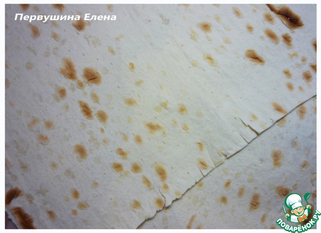 Тонкий армянский лаваш разрезать на прямоугольники ( у меня один лист делился на четыре части), можно сделать больше частей, и так как вертутики станут меньше, смотреться будет более изящно.