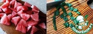 Арбуз нарезать на средние кусочки. Мяту мелко накрошить, смешать с арбузом