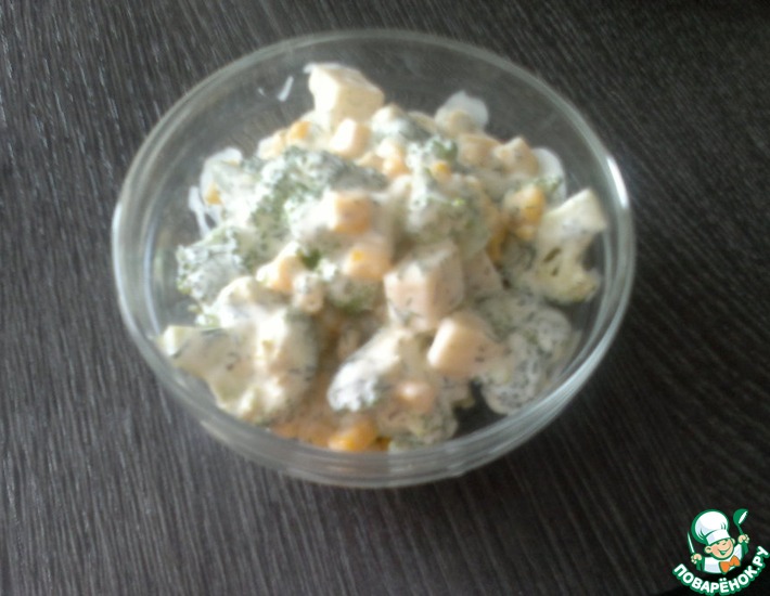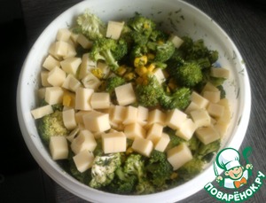 Слить жидкость с кукурузы, нарезать сыр на кубики, не берите сильно дырявый сыр, добавить к брокколи.