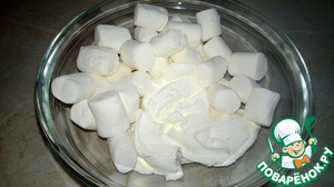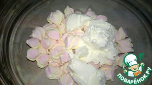 Выкладываем в стеклянную миску 250 гр маскарпоне и 200гр белого маршмелоу. Помещаем в свч с мощностью 800 на 2 минуты. -